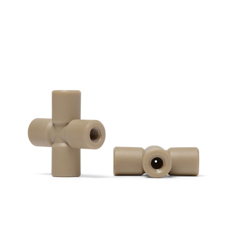 The HPLC Four Ways made of PEEK (Polyetheretherketone) are specialised components designed for 1/16" capillary tubes in High-Performance Liquid Chromatography (HPLC) systems. The 1/16" variant has an inner thread size of #10-32 UNF, the 1/8" variant has an inner thread size of #1/4-28 UNF, and the 1/16"to 1/8" variant accommodates both #10-32 to #1/4-28 UNF thread sizes with two ports of each. These four-way connectors provide versatile and reliable connections between capillary tubes and other HPLC system components, ensuring chemical resistance, high mechanical strength, and low extractables, crucial for maintaining the integrity and performance of HPLC analyses.