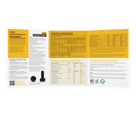 High-quality A4 datasheet that presents the key performance characteristics of RENY in a clear, professional format. Printed on 250 gsm gloss paper for durability and a premium feel, it includes comprehensive technical data covering mechanical, thermal, electrical, and chemical properties.